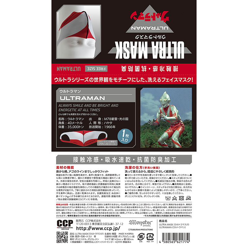 CCP ULTRA MASK (ウルトラマン マスク)CUM 日本を代表する巨大ヒーローがウイルスに立ち向かう! 日本を代表する巨大ヒーローと言えば、そうウルトラマン!昨年米国でも漫画化が決定され今年は庵野監督による「シン・ウルトラマン」の映画製作発表もあった。既にウルトラマンが誕生してから半世紀以上が経つが未だその人気は健在で親子3世代に渡り誰もが知る日本を代表する特撮ヒーローとなった。そんなウルトラマンが今回1/1抗菌マスク(Ag+)として登場。デザインも計5種、そのインパクトと共に分かる人には分かるデザインがなんともかっこいい!もはやファッションの一部として定着したマスク、こんな時だからこそマスクの下では笑顔を絶やさず、またマスクを観た人も笑顔にさせるヒーローになってほしい。 ■シリーズ名:CCP ULTRA MASK (CUM) ※衛生上の理由により、1度開封した商品は返品・交換等の対応はできかねます。 |