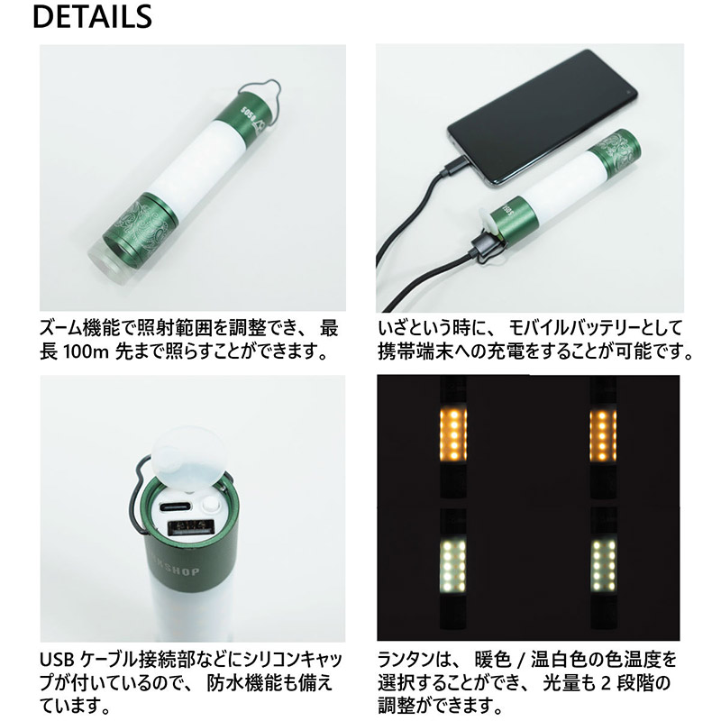 ●ランタンは、シーンに合わせて温白色と暖色をそれぞれ2段階の明るさを選ぶことができます。