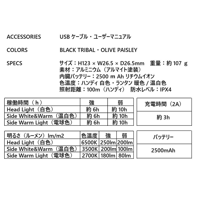 ■モード: トーチ Hi/Low ランタン Hi/Low (暖色& 温白色)