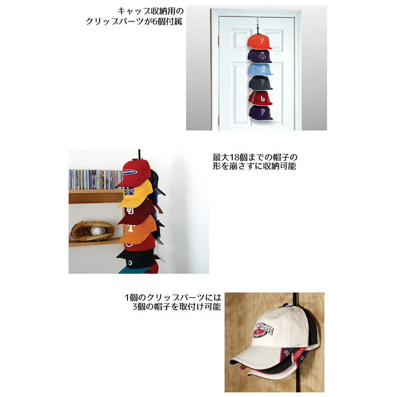 ☆キャップを最大18個まで収納できるキャップラック18 SYSTEM キャップ収納用のクリップパーツが6個付いていて、1個の取付クリップパーツには3個の帽子を取り付け可能。最大18個までの帽子の収納が可能です。吊り下げ式なので、場所をとらず収納できる優れ物。最小限のスペースで最大限の収納が可能です!!キャップを収納する部分はクリップ式になっていて帽子の頭頂部に付いているボタンを挟み込んで留まる仕組みになっています。また、ボタンが付いていないキャップでも簡単につける事が可能です! S-5325140 |